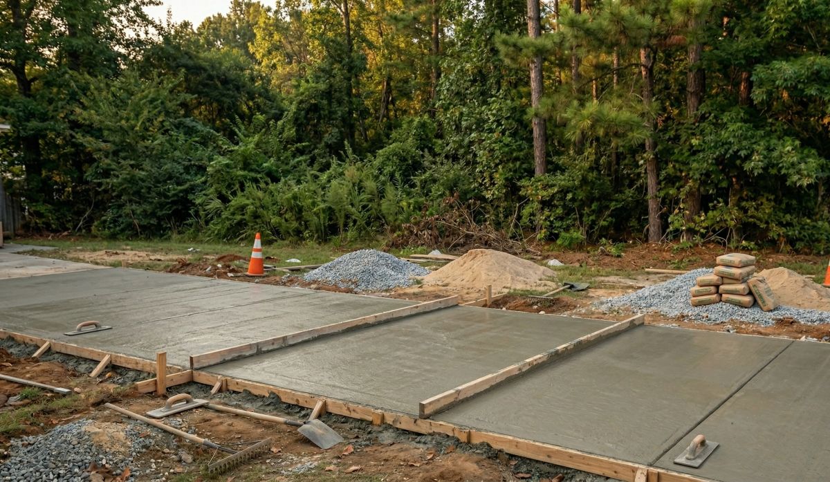 Not every concrete project starts with something to replace — sometimes a property simply needs flatwork that was never there in the first place. This McDonough project captures a fresh concrete driveway pad installation mid-pour, with freshly placed sections still curing in their wooden forms alongside materials staged for the next phase of work. The image tells a familiar story for Georgia homeowners who are tired of parking on bare dirt, gravel, or deteriorating asphalt and want a permanent concrete surface that will serve the property for decades without annual maintenance headaches.
