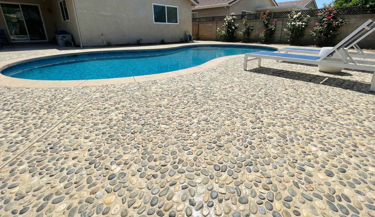 This stunning pool deck transformation showcases the natural beauty and functional benefits of river rock installations for outdoor living spaces. The homeowners wanted a distinctive pool surround that would provide slip-resistant surface while creating resort-style ambiance in their backyard. Rock and Concrete Company delivered an exceptional installation featuring smooth river pebbles in complementary tan and gray tones arranged in flowing circular patterns that echo the pool’s organic shape.